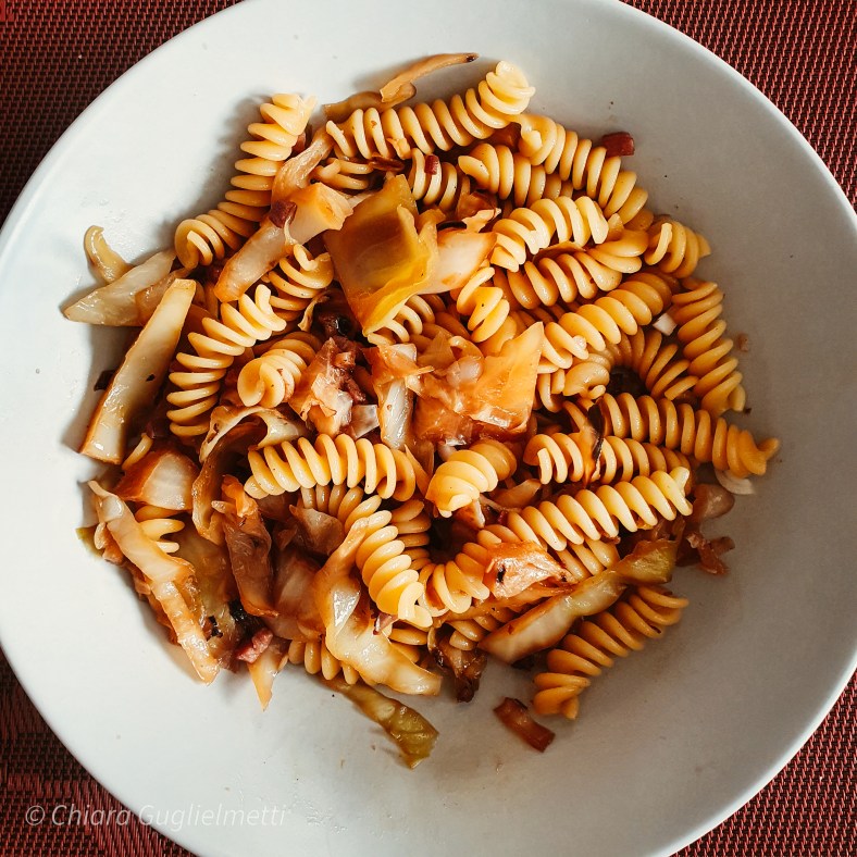- Tagliare a listarelle la verza e sciacquare sotto acqua corrente.