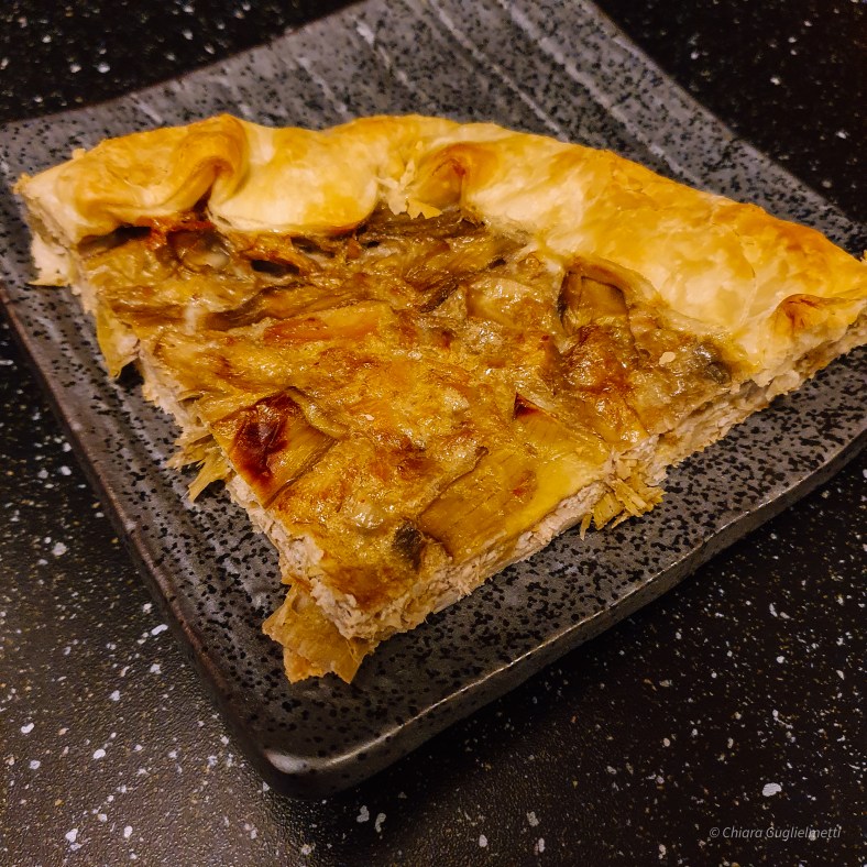 • Stendere la pasta sfoglia in una teglia rotonda dai bordi alti, farcire con il ripieno preparato e chiudere i bordi della sfoglia ripiegandoli verso interno.